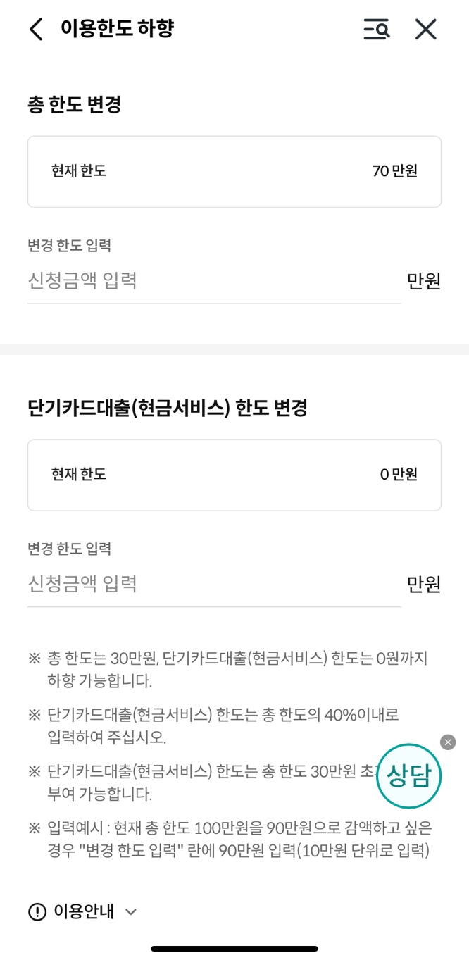 TIP: 한도를 월급의 1.5배 이하로 조정 요청, 한도를 줄일 때 이미 사용해서 결제 전 금액도 고려해야한다.